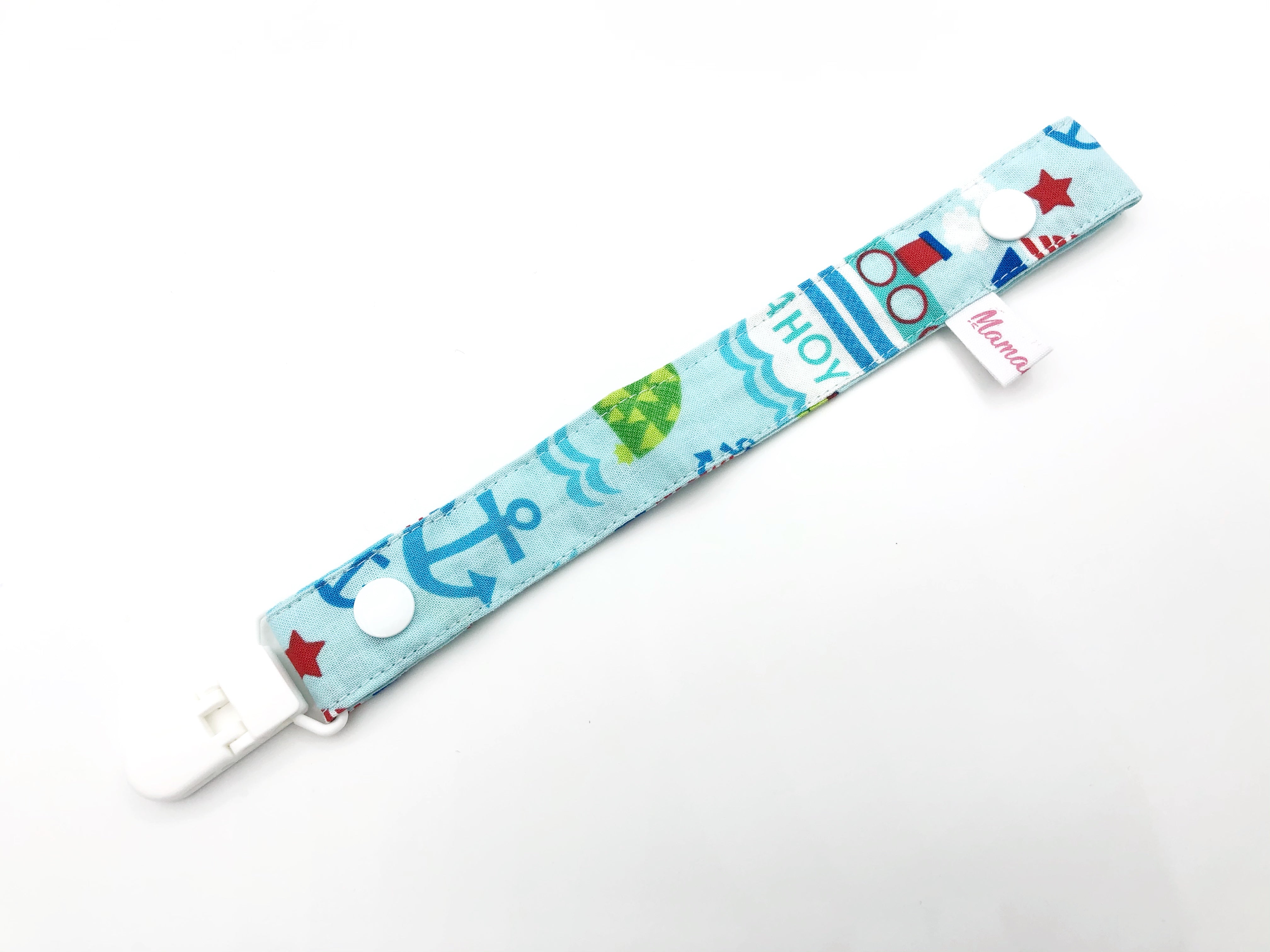 Comes with snap button on one end to secure pacifiers and a clip the other onto clothes.