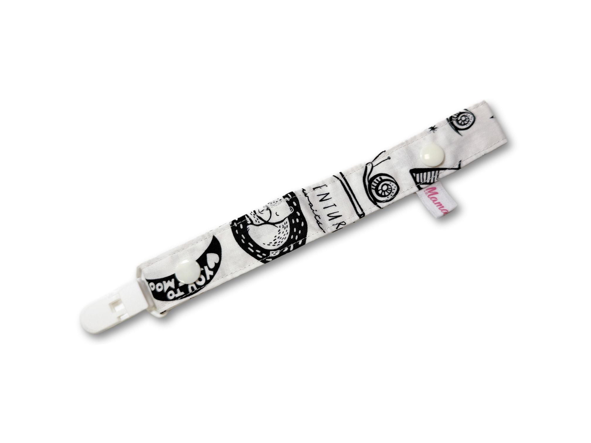 Comes with snap button on one end to secure pacifiers and a clip the other onto clothes.
